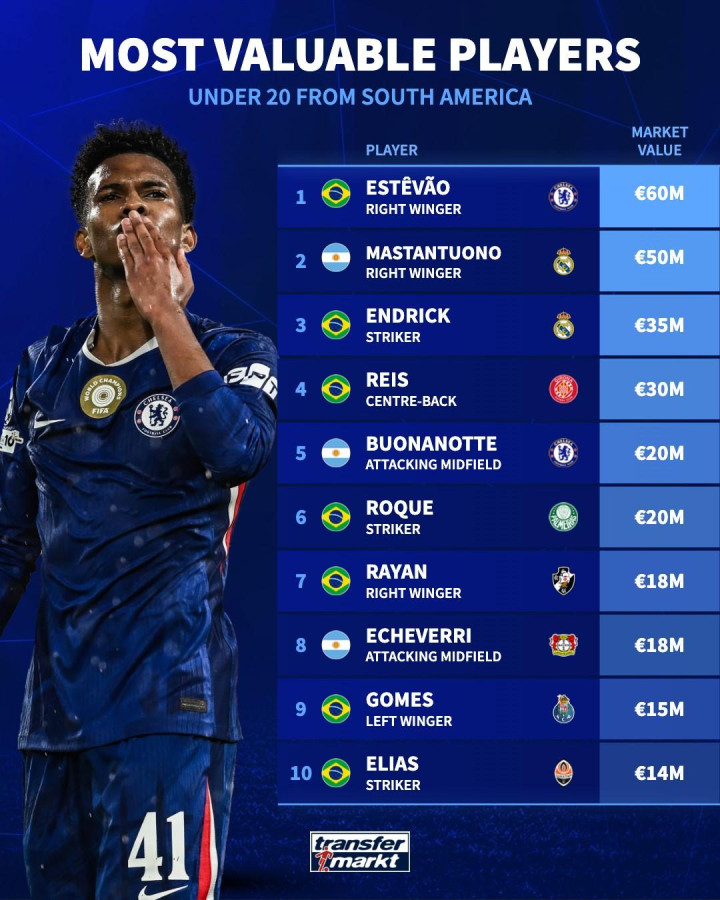 Bản tin Hupu ngày 30 tháng 10: Thị trường chuyển nhượng Đức đã tính toán giá trị hiện tại của các cầu thủ Nam Mỹ dưới 20 tuổi. Chi tiết như sau: