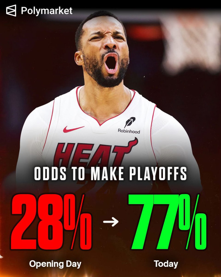 HEATINGUP:Miamiđang có xu hướng tăng,theoPolymarket.They'vewon3of4andplaytheKnickstonnight.Aretheyasleeperpicktomakearun?